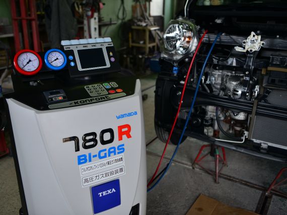 日の出鈑金塗装工業社では新ガスR1234yfに対応した最新のガス充填機を完備しています。